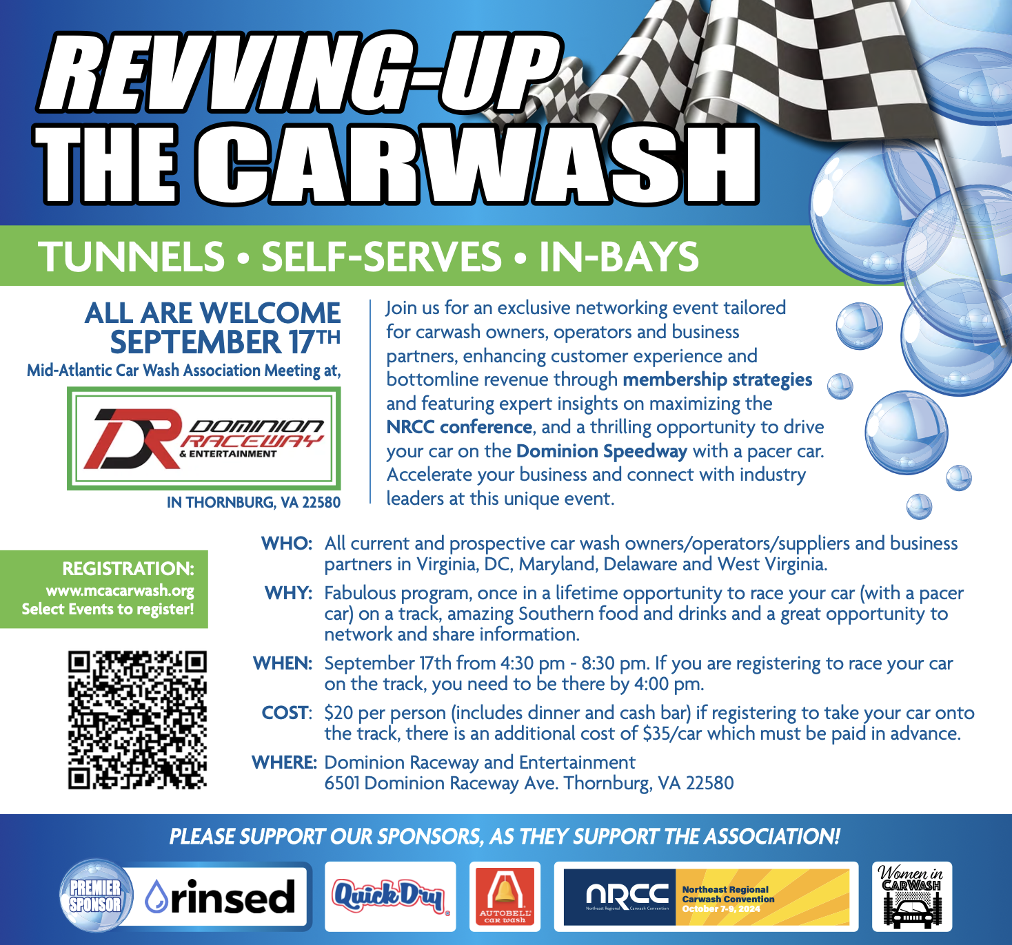 Calling all Tunnel, Self-Serve and IBA carwash owners, operators and business partners! Join us for an exciting evening at Dominion Raceway starting with registration at 4:00 pm. Registrants have the optional opportunity, at an additional cost of $35 per car to be paid at the time of the event, to race their own cars on the raceway, led by a pacer car. Pre-registration at the time of event registration is required. For those who prefer to spectate, enjoy refreshments, a car bar and appetizers will begin at 4:00 pm from a scenic nation overlooking the exhilarating raceway.